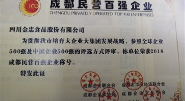 金忠食品喜獲2018成都民營百強(qiáng)企業(yè)、制造業(yè)百強(qiáng)企業(yè)稱號